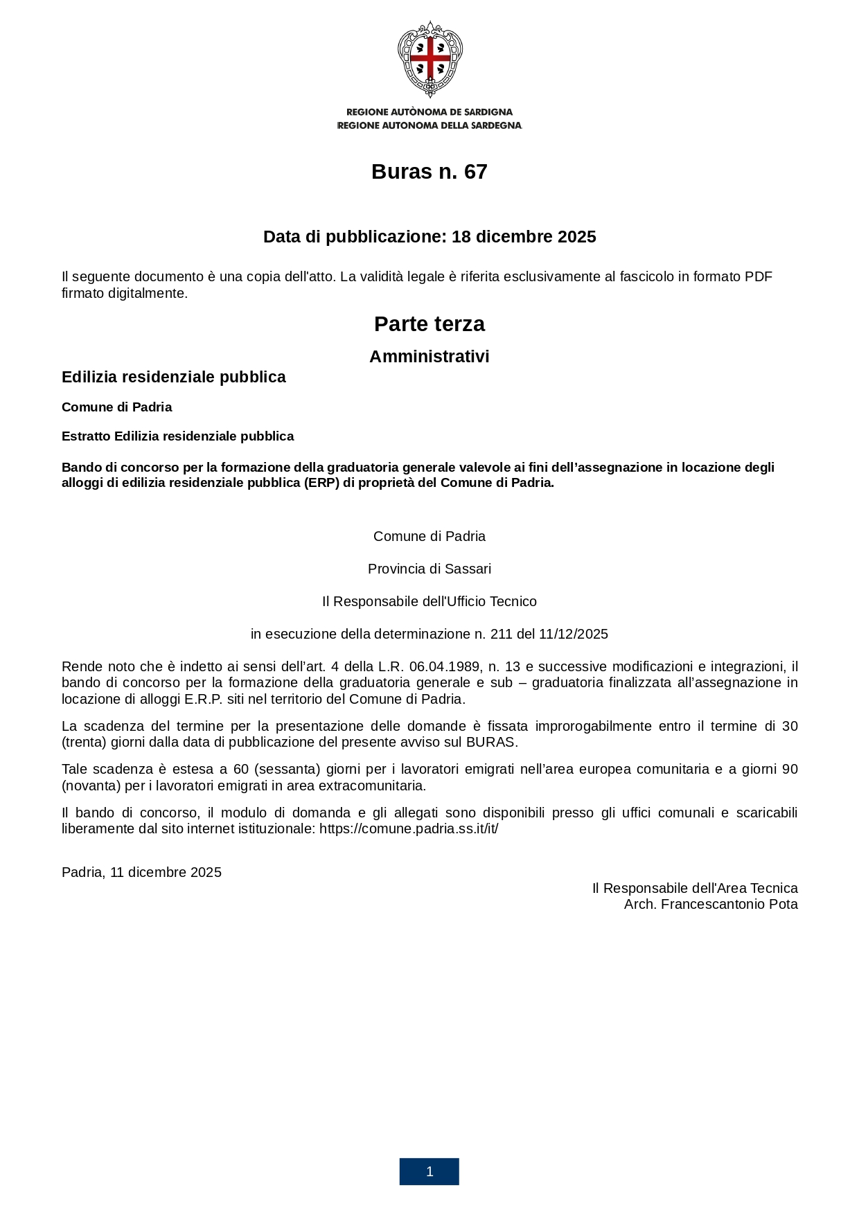 Rende noto che è indetto ai sensi dell’art. 4 della L.R. 06.04.1989, n. 13 e successive modificazioni e integrazioni, il bando di concorso per la formazione della graduatoria generale e sub – graduatoria finalizzata all’assegnazione inlocazione di alloggi E.R.P. siti nel territorio del Comune di Padria.